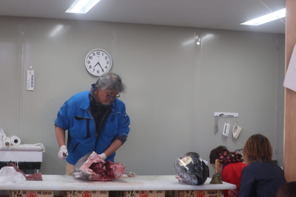 到着して間もなく、マグロの解体ショーが始まり、盛り上がっていました。